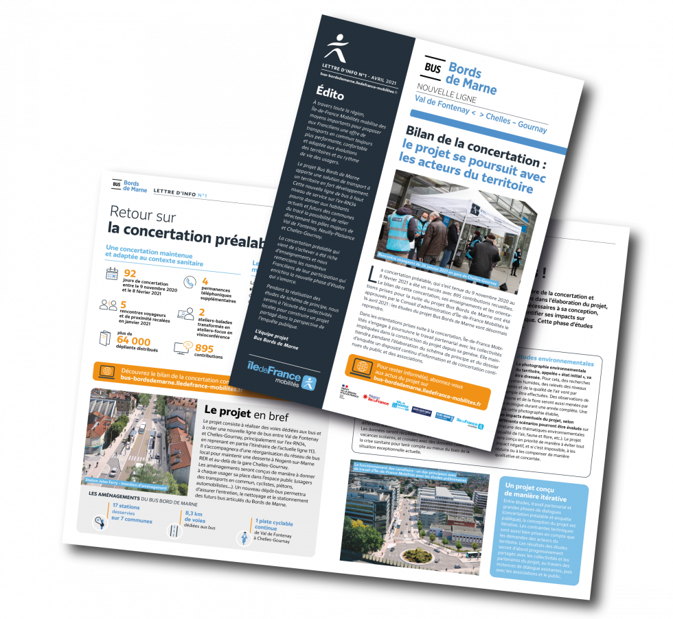 La première lettre d’information du projet Bus Bords de Marne est parue. Bilan de la concertation, présentation des études à venir et des prochaines étapes… retrouvez en quelques pages toute l’actualité du projet.