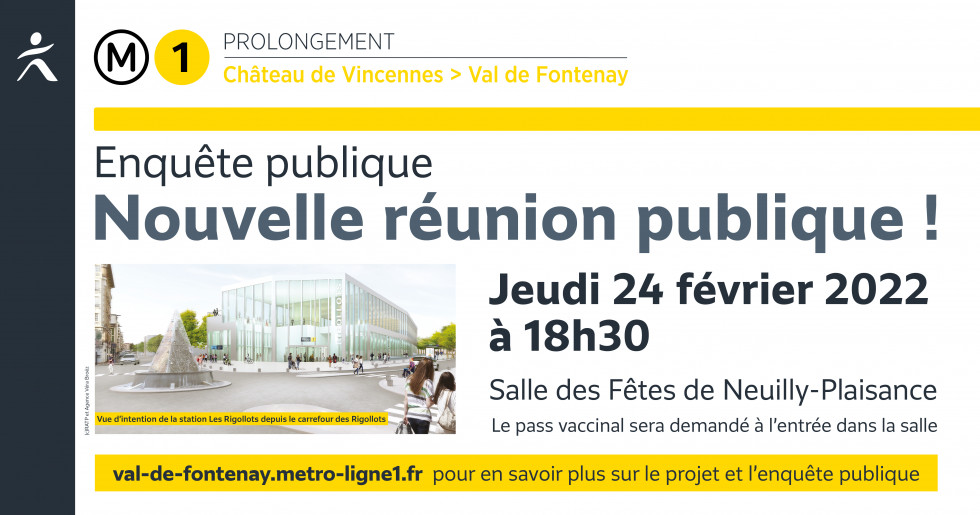 Dans le cadre de l’enquête publique en cours sur le projet de prolongement du métro 1 à Val de Fontenay, qui se termine le 2 mars 2022, une réunion publique supplémentaire est organisée à la demande de la Commission d’enquête et en lien avec la Préfecture du Val-de-Marne.