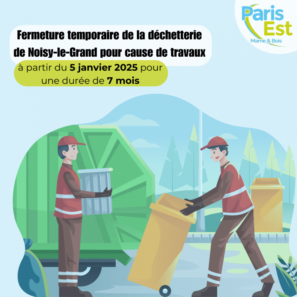 Dans le cadre du plan de modernisation des infrastructures de gestion des déchets initié en novembre 2022 par le Grand Paris, nous vous informons que la déchetterie de Noisy-le-Grand fermera temporairement ses portes au public à compter du dimanche 5 janvier 2025. Cette fermeture, d'une durée estimée à sept mois, s'inscrit dans un objectif de mise aux normes et d’optimisation de l’exploitation du site.