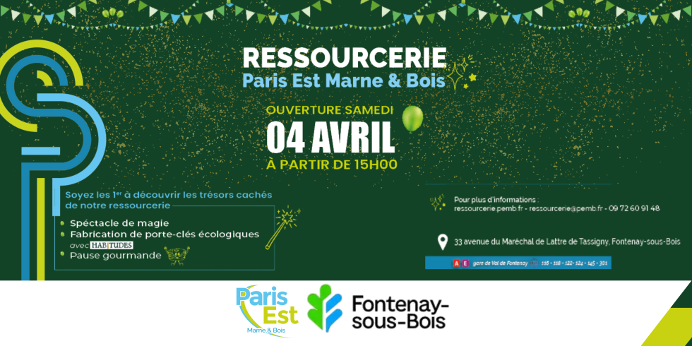 Le samedi 4 avril 2026 à partir de 15h, Paris Est Marne & Bois inaugurera sa 2e ressourcerie intercommunale sur l’éco-site de Fontenay-sous-Bois, situé au 33 avenue du Maréchal de Lattre de Tassigny.