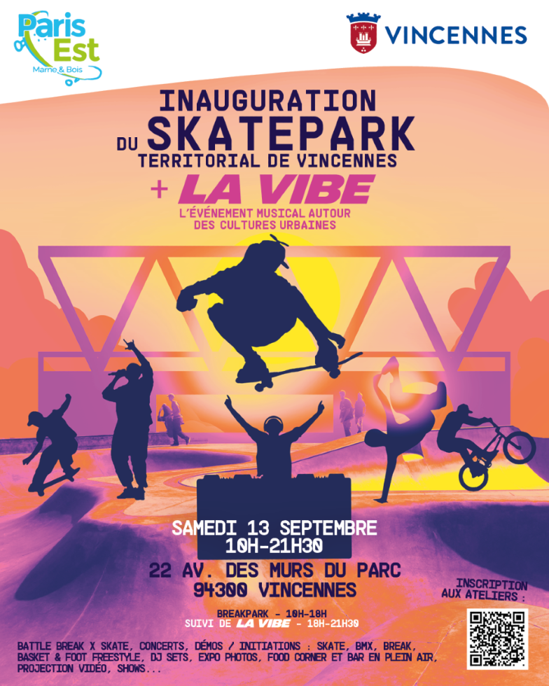 Paris Est Marne & Bois a le plaisir d’annoncer l’inauguration officielle du skatepark intercommunal de Vincennes le samedi 13 septembre 2025, de 11h à 18h.