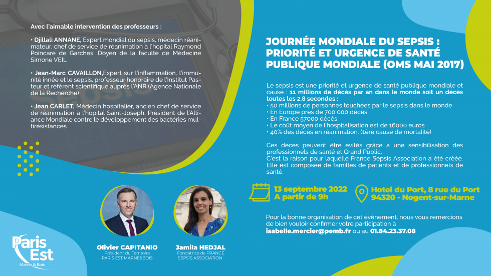 Olivier CAPITANIO, Président du Territoire Paris Est Marne&Bois et Jamila HEDJAL, Fondatrice de France Sepsis Association ont le plaisir de vous convier à un colloque à l’occasion de la JOURNÉE MONDIALE DU SEPSIS : PRIORITÉ ET URGENCE DE SANTÉ PUBLIQUE MONDIALE (OMS Mai 2017) qui se tiendra le 13 septembre 2022 à partir de 9 heures à l’Hotel du Port situé 8 rue du Port à Nogent-sur-Marne.