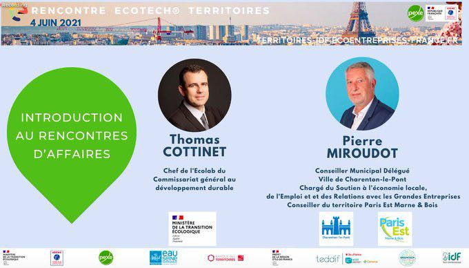 Le vendredi 4 juin 2021, la Direction du Développement Economique et de l’Emploi, ainsi que la Direction du Développement Durable de Paris Est Marne&Bois, se sont associées à l’incubateur GreenTech Innovation du Ministère de la Transition Ecologique et le PEXE IDF pour participer aux « Rencontres d’affaires des décideurs publics d’Île-de-France ».