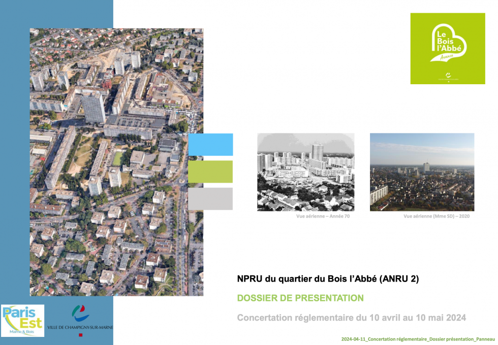 - Ce dossier de présentation du projet urbain global et ce registre de concertation sont également mis en ligne sur le site internet de la Commune de Champigny-sur-Marne à l’adresse suivante : https://www.champignysurmarne.fr/actualites/npnru-du-bois-labbe-la-concertation-commence-aujourdhui