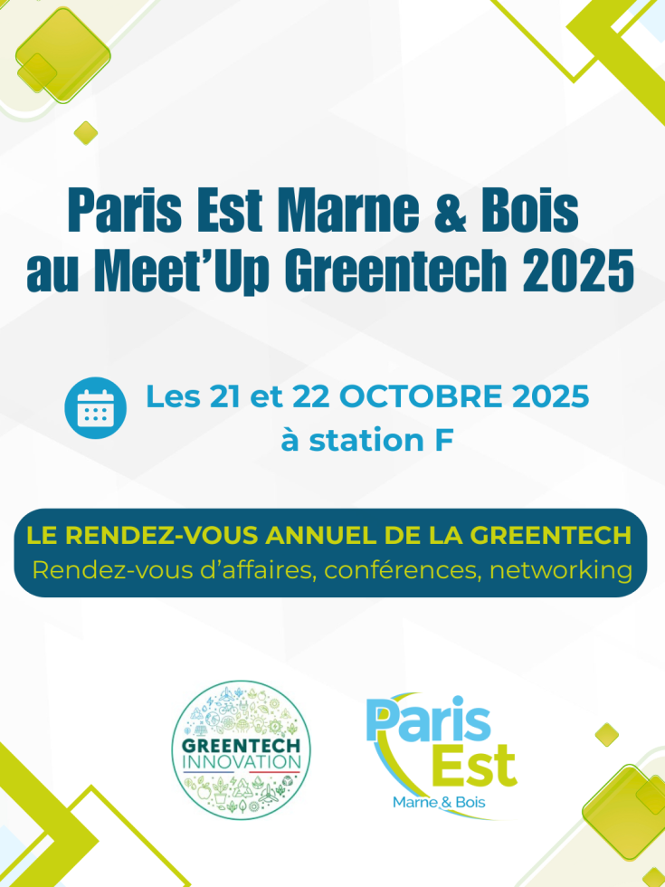 Paris Est Marne & Bois participera au Meet’Up Greentech 2025, le rendez-vous annuel dédié à l’innovation verte et à la transition écologique, organisé par le Ministère de la Transition Écologique et de la Cohésion des Territoires et Greentech Innovation.