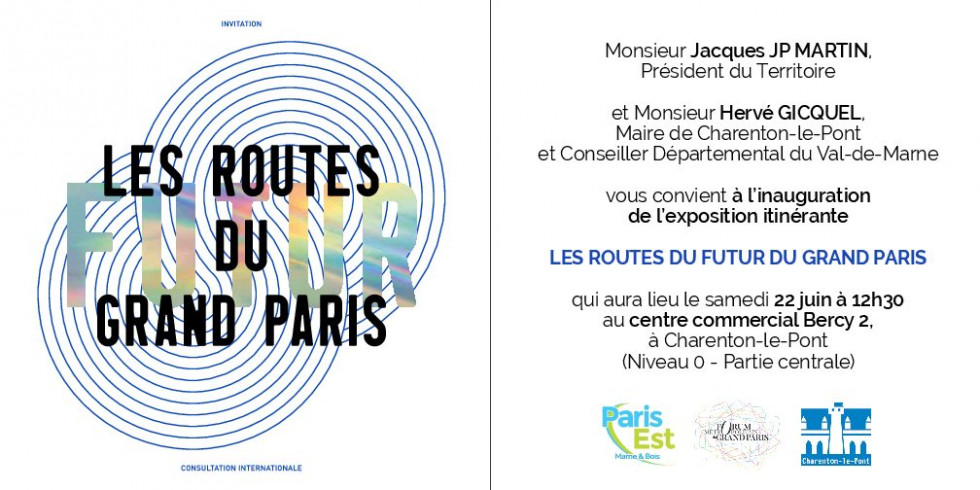 Le Territoire Paris Est Marne&Bois a l’honneur d’accueillir l’exposition itinérante « Les Routes du future du Grand Paris » du 22 juin au 6 juillet 2019, au centre commercial Bercy 2, à Charenton-le-Pont, et a le plaisir de vous convier à son inauguration le samedi 22 juin à 12h30, en présence de Monsieur Jacques JP Martin, Président du Territoire, et Monsieur Hervé Gicquel, Maire de Charenton-le-Pont.