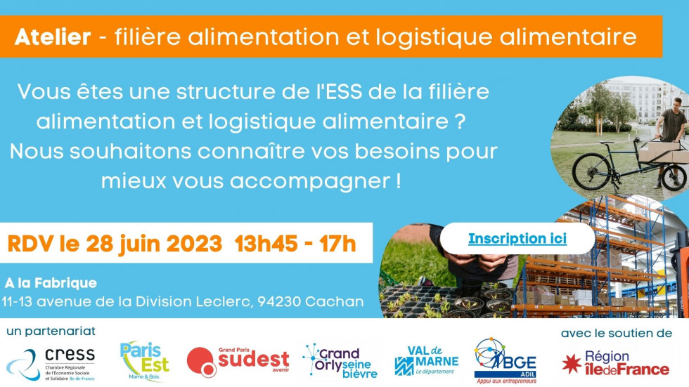 Dans le cadre du travail avec les Territoires du Val-de-Marne (Grand Orly Seine Bièvre, Paris Est Marne&Bois, Grand Paris Sud Est Avenir) et le Conseil Départemental du Val-de-Marne, le Territoire a le plaisir de vous inviter à un temps collectif d'identification des besoins des structures de l'Economie Sociale et Solidaire de la filière alimentation et de la logistique qui y est liée.