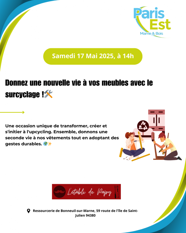 Envie de donner une seconde vie à vos meubles ? Rejoignez l’équipe de l’Établi de Papy pour un atelier de surcyclage ! Apportez un petit meuble à relooker ou choisissez-en un sur place, puis laissez libre cours à votre créativité. Repartez avec une pièce unique et personnalisée !
