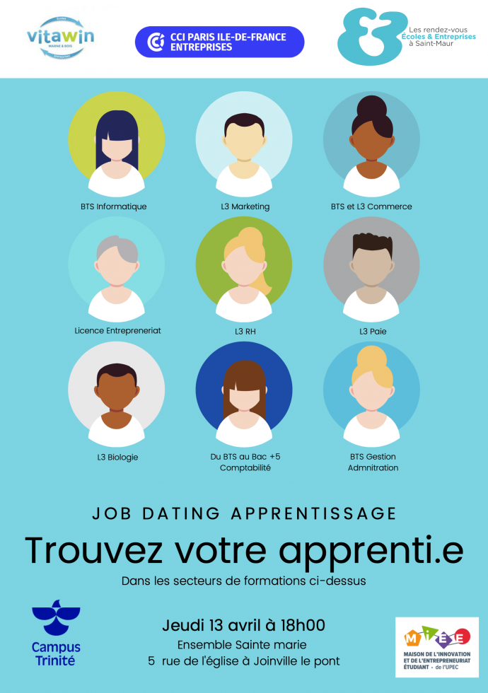 L'Association les Rendez-Vous Ecoles et Entreprises REE en collaboration avec la CCI Val-de-Marne ainsi que le collectif Vitawin de Paris Est Marne&Bois s'associent au CAMPUS TRINITE pour son JOB DATING APPRENTISSAGE.