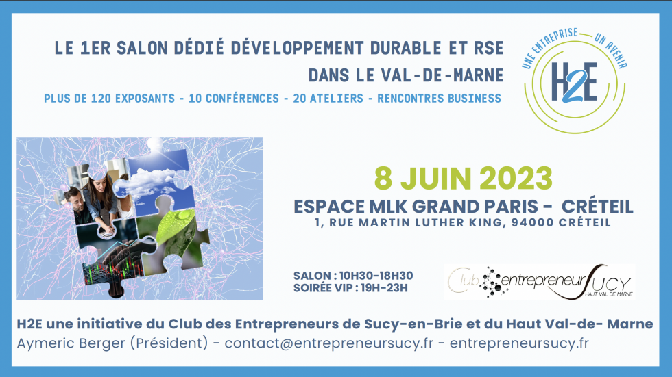 Retrouvez-nous au salon H2E, premier salon dédié au RSE et au développement durable dans le Val-de-Marne, initié par le « Club des Entrepreneurs de Sucy-en-Brie et du Haut Val de Marne » pour présenter cette démarche et l’ensemble des entreprises, acteurs et institutions qui nous accompagnent.