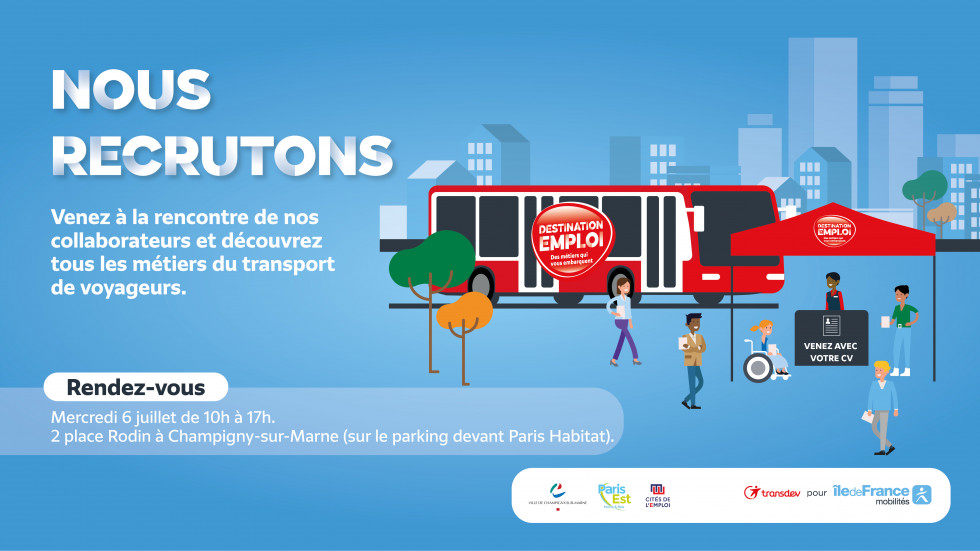 Le Territoire Paris Est Marne&Bois a le plaisir de vous convier à la seconde journée de la tournée de « Destination emploi », le 6 Juillet 2022 dans le quartier du Bois l’Abbé, à Champigny-sur-Marne. Cette action portée dans le cadre de la Cité de l’emploi est réalisée en partenariat avec la commune de Champigny-sur-Marne et la société Transdev.